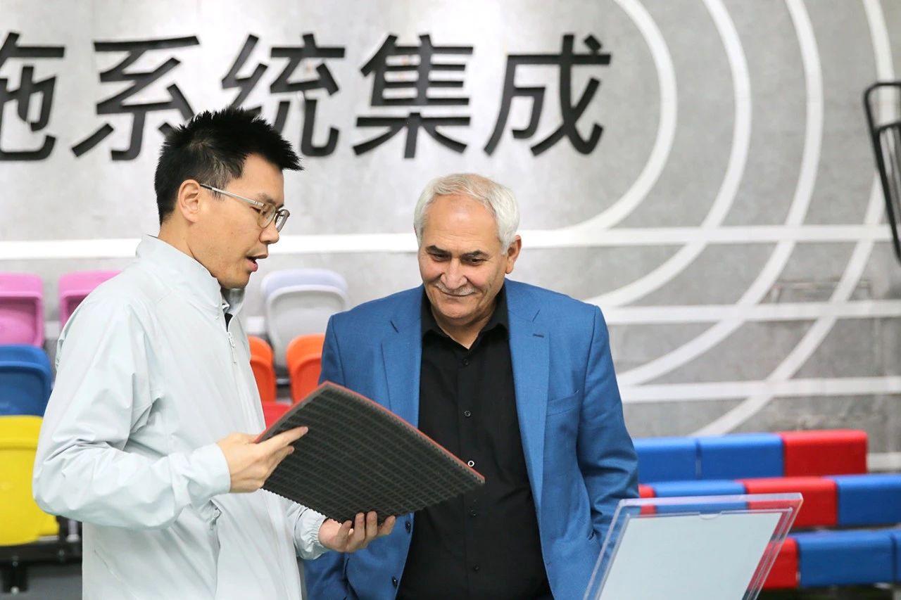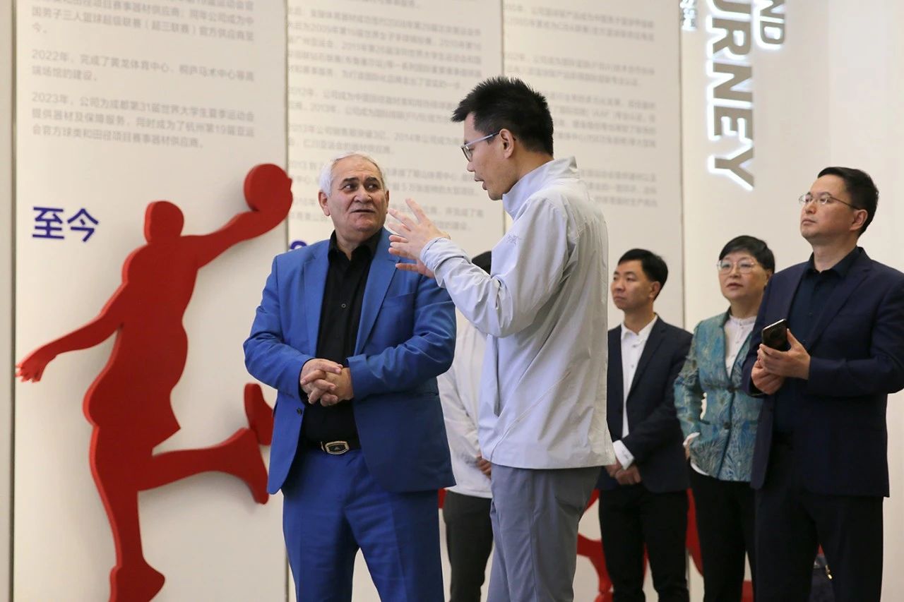 穆哈邁德·扎路主席一行在國家體育總局舉摔柔中心主任劉成亮、蘇州市體育局副局長程軍紅、張家港市文體廣旅局局長周穎和金陵體育總經理李劍剛的陪同下,參觀了公司數字化展廳、產品展示館、智能化制造車間、檢測中心和金陵洲際文體,詳細了解了金陵體育的發展歷程、業務版圖以及智能化球館、籃球租售終端等數字化、網絡化、智能化技術下的創新模式和落地成果。