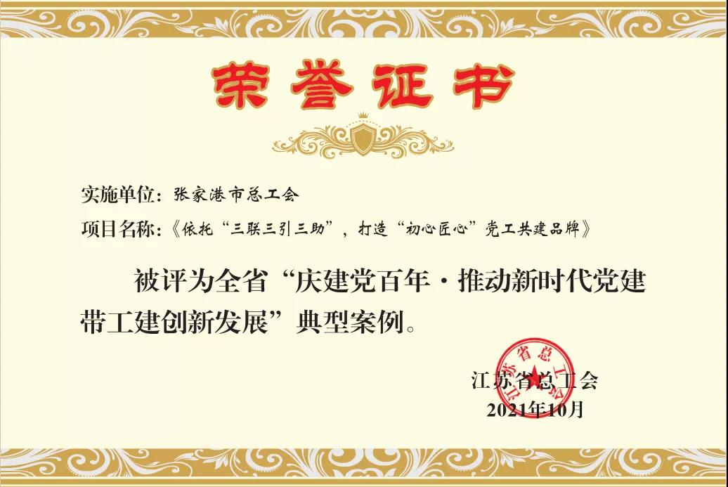 日前,“慶建黨百年·推動新時代黨建帶工建創新發展”優秀成果發布,我市總工會“依托‘三聯三引三助’打造‘初心匠心’黨工共建品牌”被評為江蘇省典型案例。